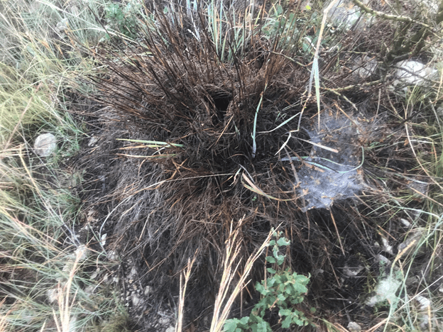 The importance of carefully monitoring rangeland conditions is essential when working with grazing lands. Conditions or issues can be averted or at least addressed if the grazing manager is closely watching the rangeland and livestock performance. As the picture of Indian grass shows, this once healthy-vigorous plant (Photo 2) has become moribund and has ceased to be a healthy contributor to the rangelands improving health. The dark brown to black area is what used to be a thriving Indian grass plant, due to lack of animal impact or any other disturbance to cause new growth nodes to produce new growth the leaf structure has slowly died. (Note the center of the plant has hollowed out with dead material.) Yet in its struggle to survive green shoots of new growth are occurring. Think what the root structure must look like, probably much like what we see on the surface.